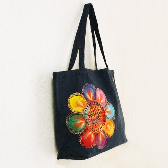 黒にニャンドゥティレースが映える大きめで、肩掛けができる、コットントートバッグです。