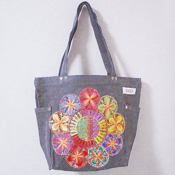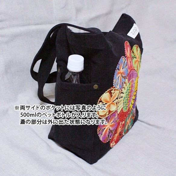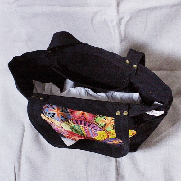 黒にニャンドゥティレースが映える厚手でポケット付きの、大きめのコットントートバッグです。