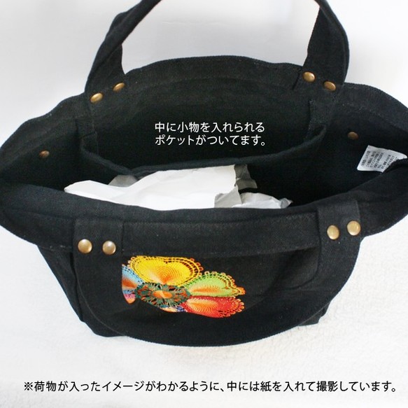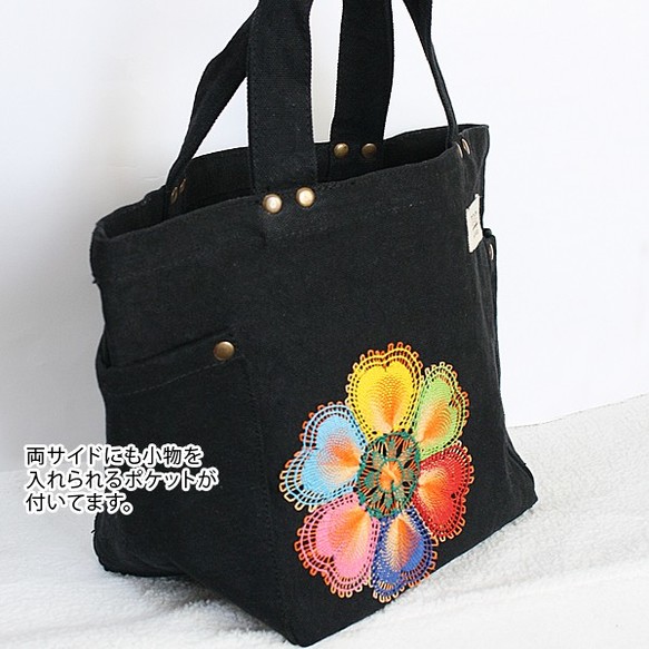 黒にニャンドゥティレースが映える厚手でポケット付きの、コットントートバッグです。
